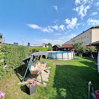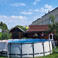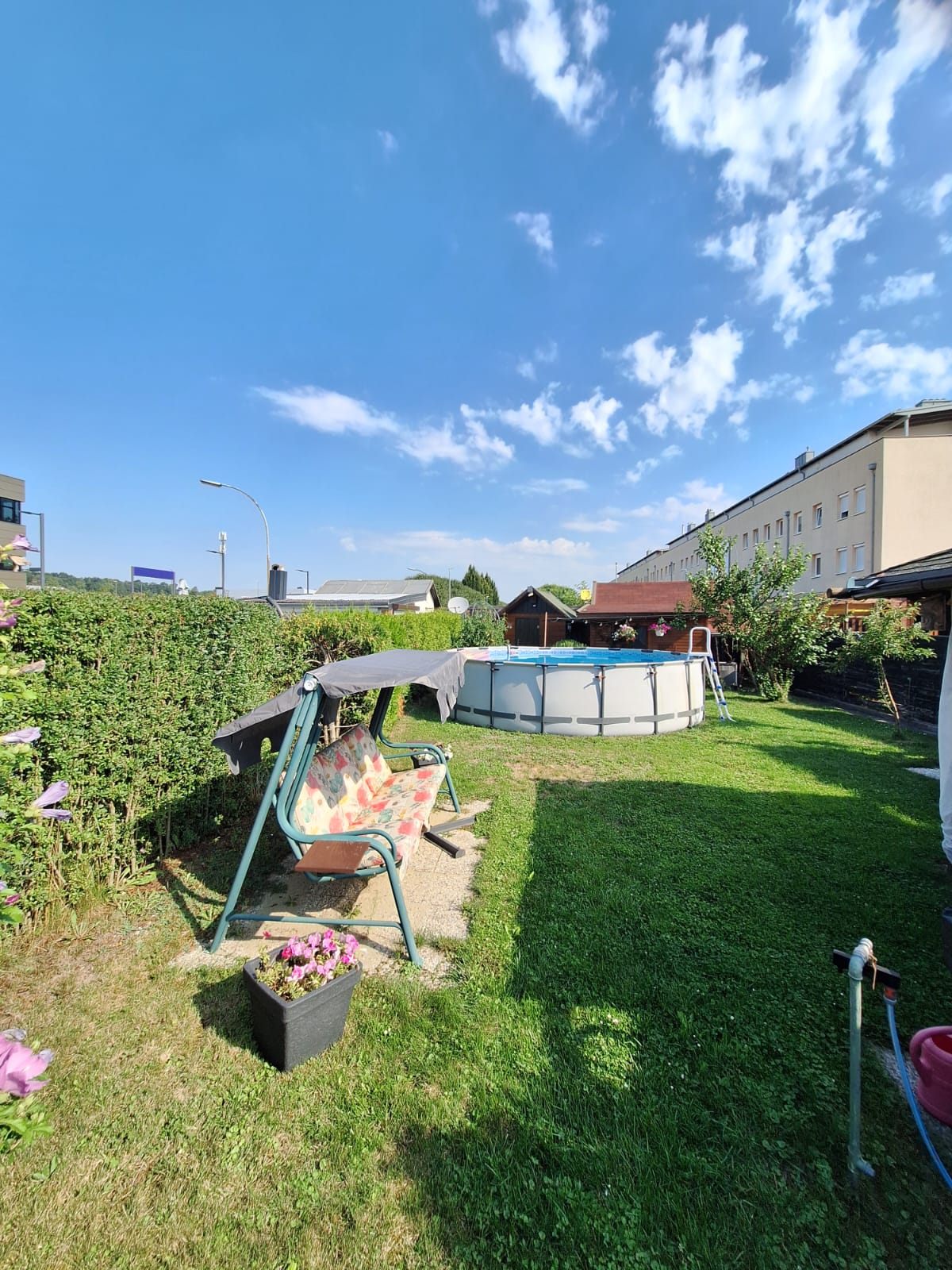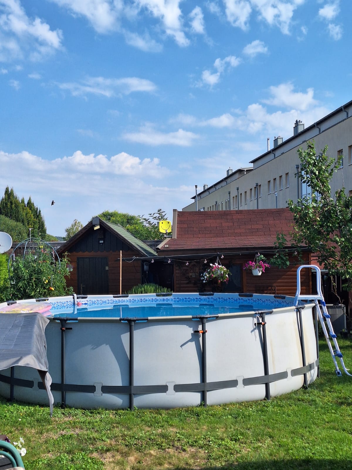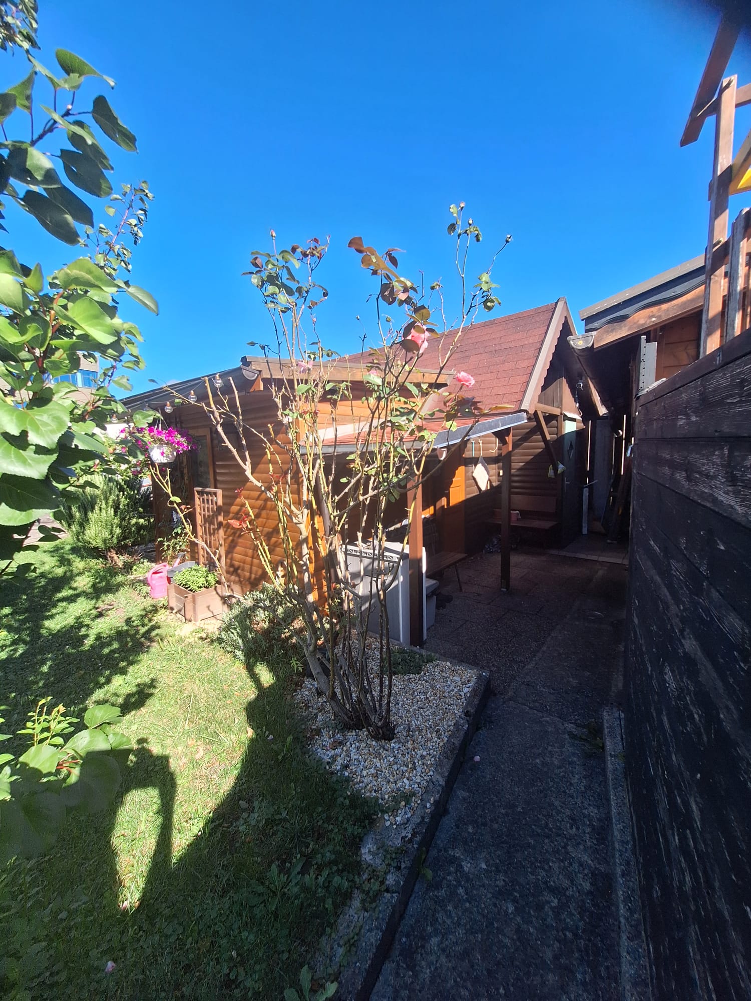 Ein schöner Garten mit Gartenhäuschen und Pool.