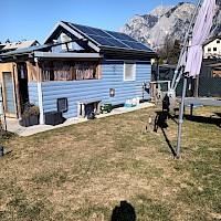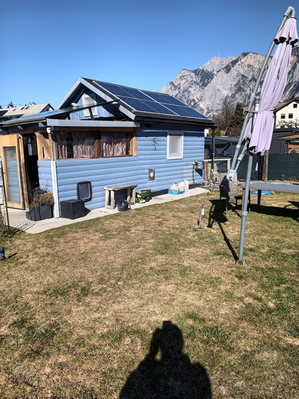 Gepflegter Garten mit Gartenhütte und kleiner Terrasse, mit Solaranlage.
