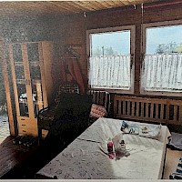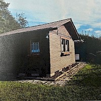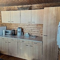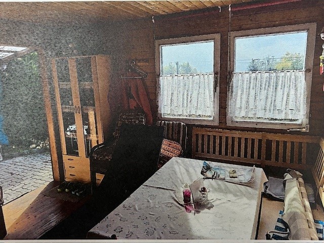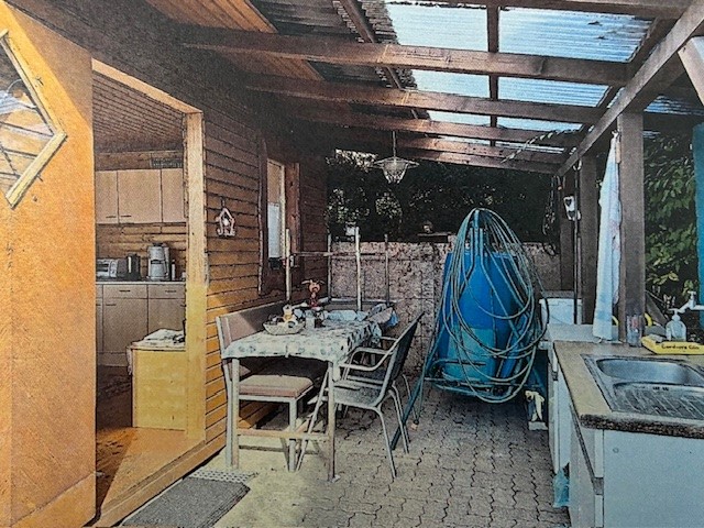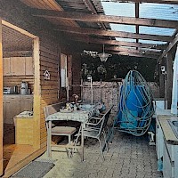 Gartenhütte mit Terrasse, Küchenblock inclusive Geräte mit Stromanschluß, Hütteneinrichtung, Rasenmäher