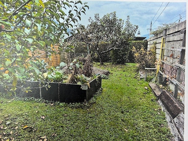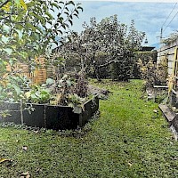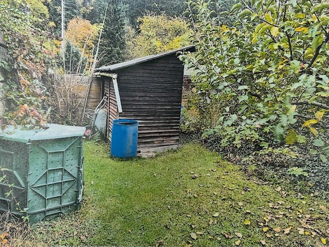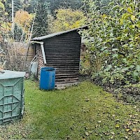 Garten mit Gemüsebeet, Sträucher und Bäume, eine alte kleine Gartenhütte.
