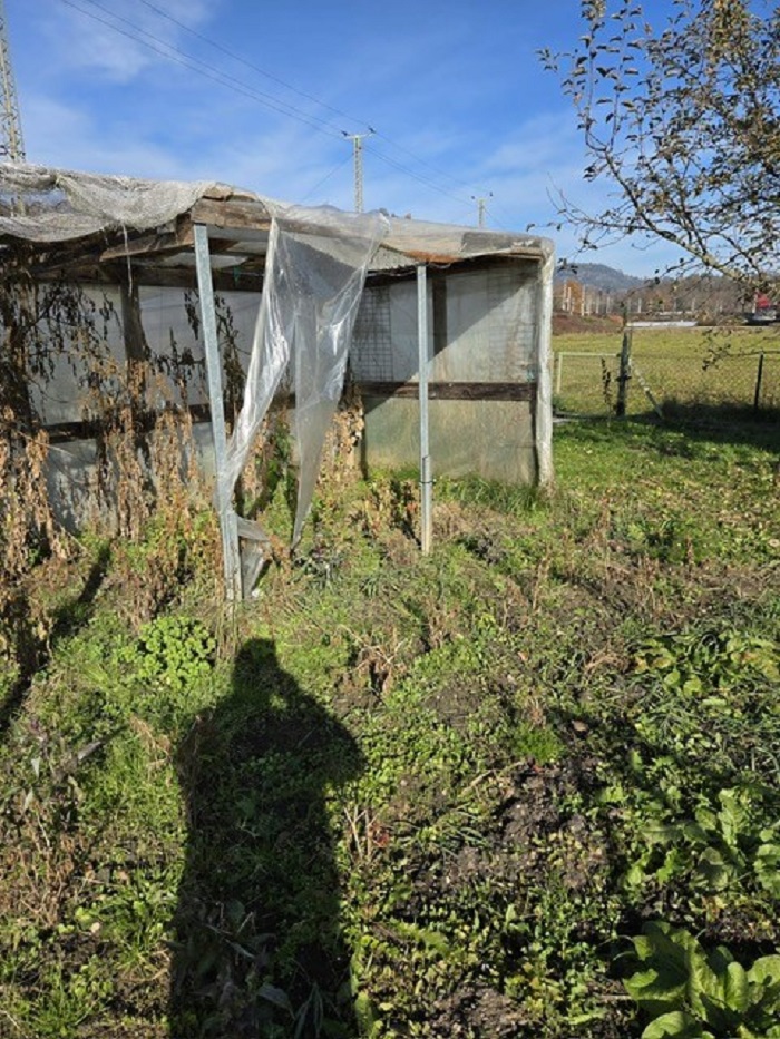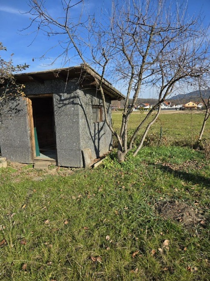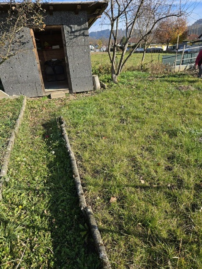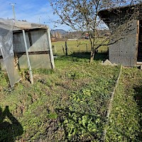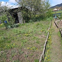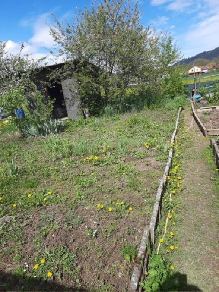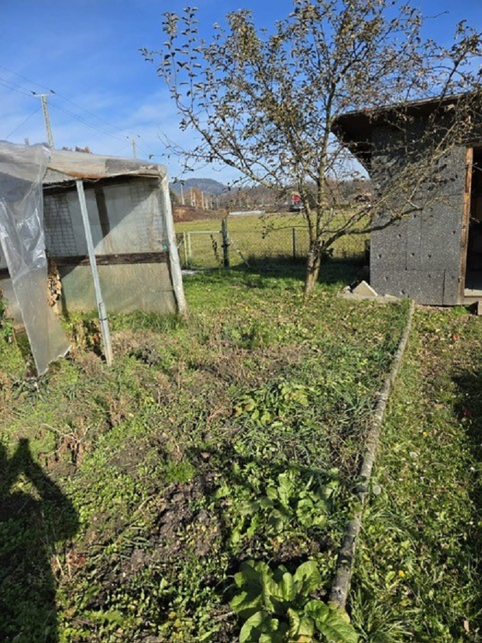 Garten mit kleiner Gartenhütte, Gemüsegarten, Wiese und Sträucher.