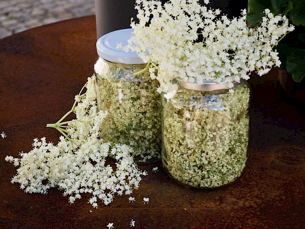Blüten, Beeren und sogar Blätter: Fast alles am Holunder kann verarbeitet werden. Die Blüten werden gebacken oder getrocknet, oder zu Sirup, Gelee oder einem abschwellenden Fußbad verarbeitet; die Beeren schmecken als Holunderkoch, als Marmelade oder Saft; und aus den Blättern (Achtung: Roh sind sie giftig!) kann Tee oder Pflanzenjauche zur Schädlingsbekämpfung hergestellt werden.