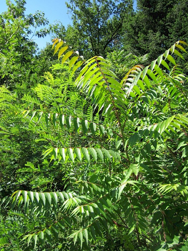Wissenswertes: Der Götterbaum (Stinkesche) gilt als schnellwüchsigster Baum Europas (bis zu drei Meter/Jahr). Er kann 30 Meter hoch werden. Die Blätter sind auffallend groß und gefiedert. Im Juli zieren gelb-grüne, rispenförmige Blüten den Baum, ab August leuchtend rote Fruchtstände. Gegenüber Schadstoffen, Trockenheit oder Streusalz ist er unempfindlich und kann auch aus kleinen Ritzen in Gehsteigen und Mauern problemlos wachsen.