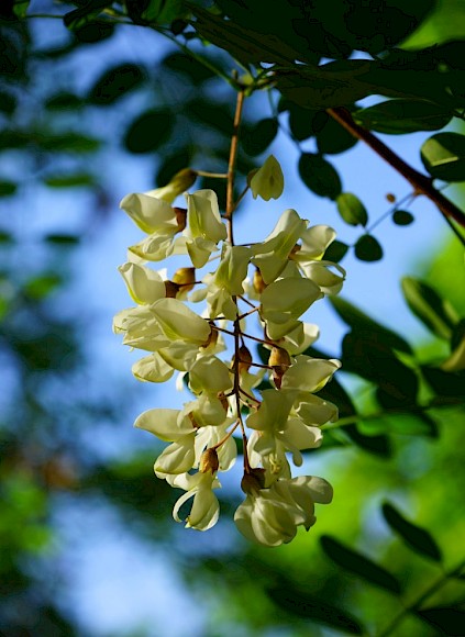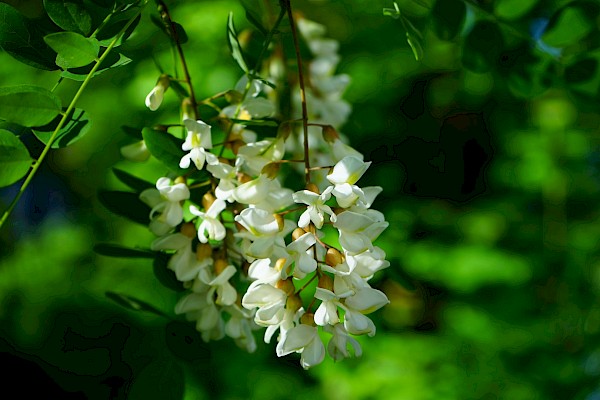 Wissenswertes: Auch Akazie genannt, ist der bis zu 30 Meter hohe Baum bekannt für seine weißen, süß duftenden Blüten, die im Mai und Juni traubenförmig an jungen Trieben hängen und bei Imkern beliebt sind (Akazienhonig). Die Krone der Robinie ist schirmförmig, die Blätter sind gefiedert. Der Baum ist resistent gegen Frost, Hitze, Dürre und Salz; das Holz ist besonders witterungsbeständig.
