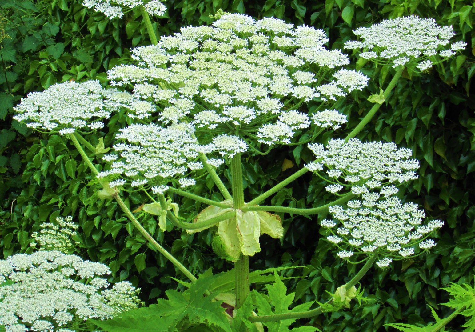 Wissenswertes: Der Riesenbärenklau wird bis zu vier Meter hoch und trägt tief eingeschnittene Blätter. Die imposanten, schirmförmigen Blüten blühen von Juni bis September weiß; die Stängel sind hohl und rot gesprenkelt. Jede Pflanze bildet bis zu 50.000 Samen aus, die bis zu zehn Jahre lang keimfähig bleiben.