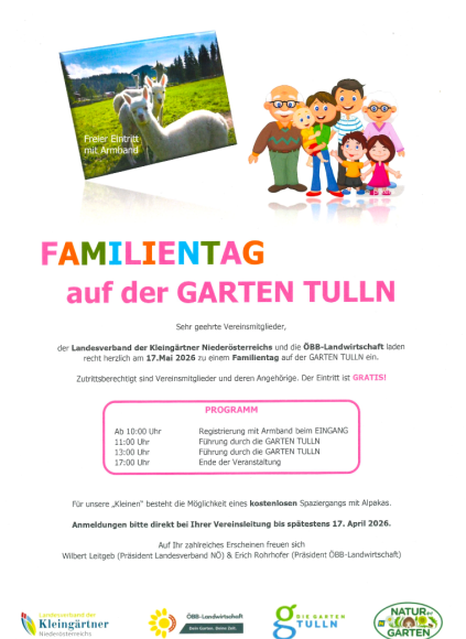 Der Landesverband der Kleingärtner Niederösterreichs und die ÖBB-Landwirtschaft laden alle Vereinsmitglieder und deren Angehörige herzlich am 17. Mai 2026 zum Familientag auf der GARTEN TULLN ein. Der Eintritt ist gratis!