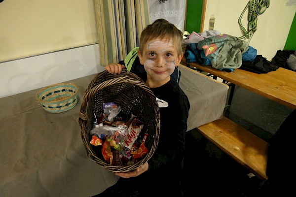 So eine Schatzsuche macht hungrig. Nach einer ordentlichen Stärkung im Vereinshaus mit Würstchen und Kuchen ging es weiter mit dem traditionellen Umzug "Süßes oder Saures". Und wieder machten sich 25 schaurig schöne Gestalten gemeinsam auf den Weg um viele, viele Naschereien einzusammeln.