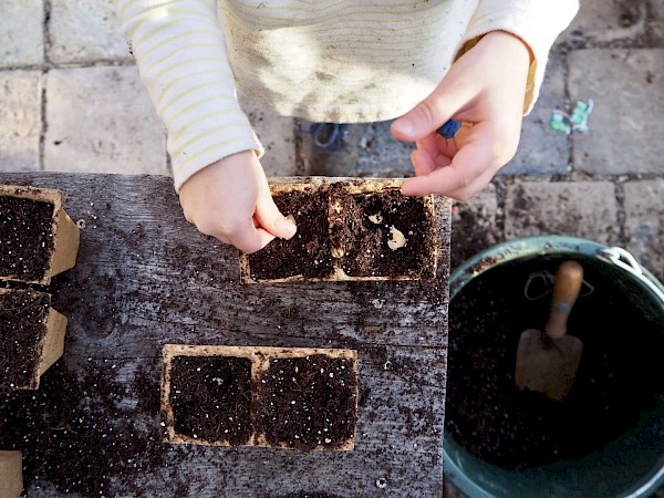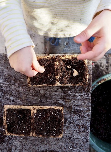 2. Jetzt kommen die Samen in die Erde: Große etwa einen Zentimeter in die Erde drücken, kleinere nur mit einer dünnen Schicht Erde bedecken.