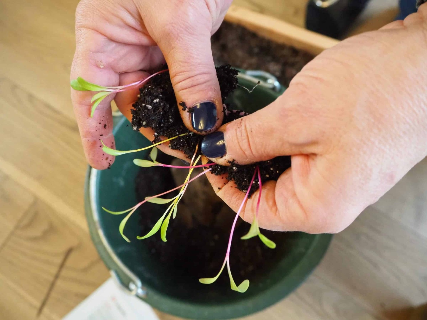 6. Jetzt sollten die Setzlinge in größere Gefäße wandern. Dafür die Wurzeln vorsichtig aus der Erde lösen. Sind mehrere Pflanzen in einem Töpfchen, die Wurzeln vorsichtig voneinander trennen.