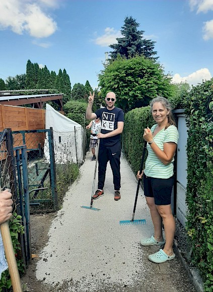 Und am 16. 6. 2023 ging's los. Es wurde geschaufelt und gerecht, was das Zeug hielt. Ausgerechnet am ersten heißen Tag des Jahres. Aber besser als Regen! Es waren so viele Helfer da, dass es einen Stau wie am Montagmorgen auf der Süd-Ost-Tangente gab. Alle waren da, sogar unsere Jüngsten arbeiteten eifrig mit. Jene Mitglieder, die keine Zeit hatten, spendeten kühle Getränke, über die sich alle freuten.